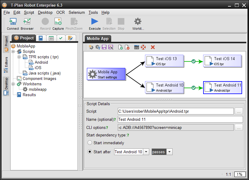 For example, consider automation of a mobile phone application. There are two scripts to automate it on iOS (iOS.tpr) and Android (Android.tpr). The plan is to execute it first on an iOS 13 device and when it passes re-run it also on iOS 14. Automating on Android will be started in parallel. It will be first performed on an Android 10 device and if it succeeds will be re-run on an Android 11. The workitem will look as follows: