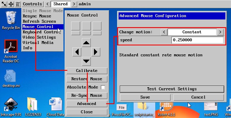 An often experienced issue is broken mouse synchronisation. You see two mouse pointers with a distance from each other and mouse actions (clicks, drags) are misplaced. This is a misconfiguration of the KVM system and not a T-Plan Robot issue. To fix it connect perform the following steps on the KVM system: