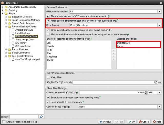 Open Preferences through the Edit->Preferences item in the T-Plan Robot Enterprise menu and select the RFB (VNC) 3.x Client panel: