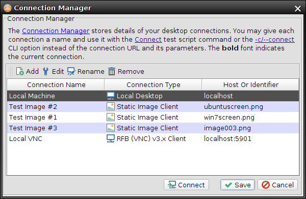 The stored connections can be managed through the Connection Manager window available from the Login Dialog or through the Desktop->Connection Manager menu item.