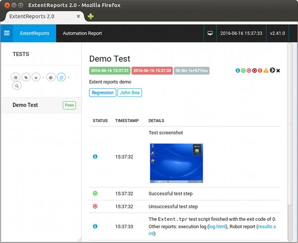 // Load the plugin saved to the project dir Include "../extent-plugin.jar" // Start the Extent report Run "com.tplan.extent.Report" desc="Extent reports demo" file="extentreport.html" name="Demo Test" // Set the author, category, target system and Robot version Run "com.tplan.extent.Set" author="John Doe" category="Regression" param="System" value="Windows 7 64-bit" Run "com.tplan.extent.Set" param="Robot" value="{_PRODUCT_VERSION_LONG}" // Start also the Robot report to show how it gets linked Report "results.xml" // Produce some reportable objects // Screenshot Screenshot "myscreen.png" desc="Test screenshot" // Record one PASS and one FAIL test step Step "Successful test step" pass Step "Unsuccessful test step" fail // Exit with the code of 0 which means the overall PASS result Exit 0