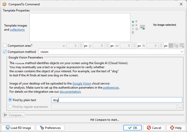 The Google Vision ("vision") method identifies objects on your screen using the Google AI (Cloud Vision). It was introduced by Robot 8. You may use a text or a regular expression to verify whether the screen contains the object of your interest. For example, use the text of "dog" to test if the AI finds at least one dog on the screen.