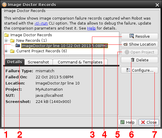 If Robot was started in the automation mode (with the r/-run CLI option) and a command or a Java method call employing image comparison fails in the currently executed script, the wizard records the failure through the Image Doctor Records facility.