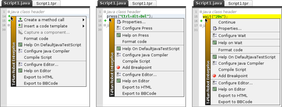 The Editor Context Menu provides access to selected actions of the script and/or the particular script element at the current line.