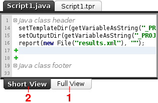 The Short View displays just the contents of the test() method (or the main try/catch block inside the method) which represents the script body. The rest of the Java class is collapsed into the Java Class Header and Java Class Footer nodes. These can be eventually expanded through a click onto the + box.