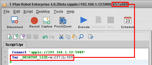 To apply the target size to the current iOS Mirror screen highlight (select) the variable code line and click the Selection tool bar button. This will execute the variable command and set the screen size. See the Execute Selection for details on code block execution. Future releases will deliver support of screen size forcing through the GUI tools such as the Login dialog and the Connect command property window.
