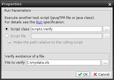 Java test scripts may be easily called from a script in the TPR format. Java test scripts belonging to the same project can be called from the TPR code right away through the Run command. Java classes bundled in a JAR file or located in other folder than the project Java home of <projectHome>/src must be first imported through the Include command. Let's imagine a simple project consisting of two test scripts, a Java one called Verify.java and a TPR one called TestFile.tpr: