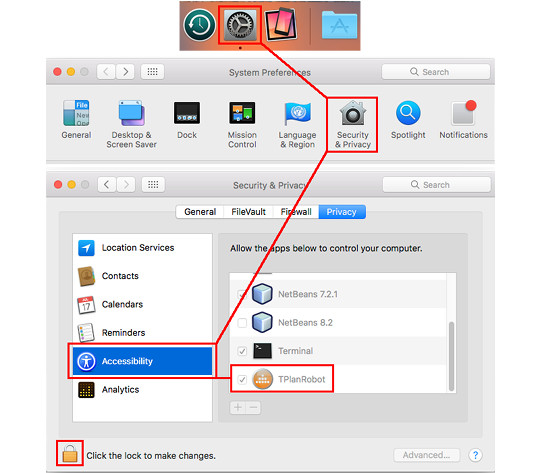 Select Accessibility in the left column and inspect the tick box next to the "TPlanRobot" app. If you are using the cross-platform release the app may be titled as "Java".