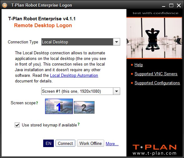 T-Plan Robot Enterprise version 3.2 introduced support of automation of applications displayed on the local desktop. This means that Robot and one or more Applications Under Test (AUT) run on the same local desktop. The automation is of course not limited to the AUT and it may perform any desktop action that a regular user can do.