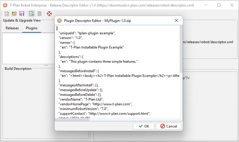 As you have seen already plugin archives and Robot releases are being distributed via the Update & Upgrade window. The data it displays is loaded from the 'release descriptor'. It is an XML file which is placed on a HTTP server at a known address. For example, the default T-Plan descriptor is located at: