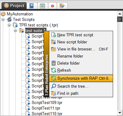 - For manual synchronization in the GUI right click a project, a work item (a script or workitem tree node) or a relevant folder node in the Project View and select the "Synchronize with RAP".