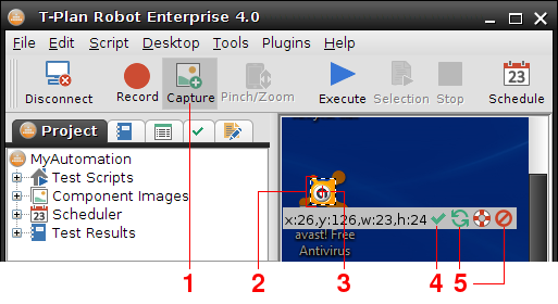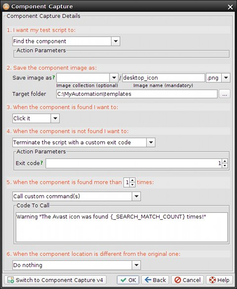 コンポーネントキャプチャウィンドウでは、ターゲットとなるテンプレート画像ファイルと、スクリプトによって実行されるタスクを定義します