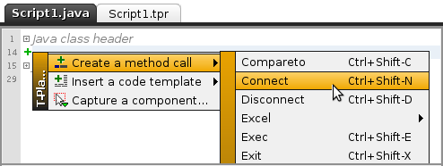エディタコンテキストメニューでは、スクリプトの選択されたアクションや、現在の行にある特定のスクリプト要素(コマンドや Java メソッド呼び出し)にアクセスできます。詳細については、エディタコンテキストメニューの章を参照してください。