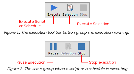アクティブなエディタで開かれたスクリプトは、メインGUIウィンドウのスクリプトメニューのコントロール、または対応するツールバーボタンを使用して実行できます。