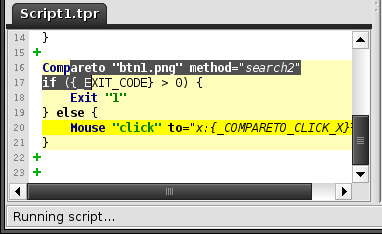 エディタでは、スクリプト全体ではなく特定のコマンドブロックのみを実行できます。実行したい行を選択(ハイライト)し、選択範囲の実行メニュー項目またはツールバーボタンを選択します。コマンド全体をハイライトする必要はありません。コマンドの単一文字のみを選択した場合でも、T-Plan Robot は行全体を実行します。次の図は、CompareToコマンドとif/elseブロックにまたがる実行を示しています。