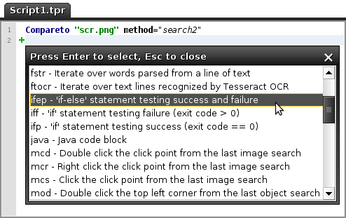 画面認識で動作するアクションのブロック全体を作成するには、コンポーネントキャプチャ機能を使用します。より細かい開発には、コマンドウィザード(Ctrl+Enter または右クリック->コマンド/メソッド呼び出しの作成)を利用して、アトミックなスクリプト操作を作成してください。あるいは、スクリプト記録機能を使用して、スクリプト内のマウスおよびキーボードイベントの基本的なフローを生成することもできます。詳細はスクリプトレコーダーヘルプトピックを参照してください。生成されたコードには手動で調整を加えてください。タイムアウトの変更、コマンドの統合、再利用可能なプロシージャの作成、必要に応じて変数によるコマンド引数のパラメータ化などを行います。