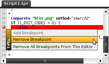 [一時停止]メニュー項目またはツールバーボタンを選択解除するまで再開されません。ブレークポイントを定義するには、エディタのガターをクリックします。クリック位置の右側の行には、有効なコマンド(TPRスクリプト)またはJavaScript APIのメソッド呼び出しが含まれている必要があります。(Javaスクリプト)。エディタの行が赤色に変わり、ガターに赤い地球アイコンが表示されます。別のブレークポイント作成方法として、ガターを右クリックし、コンテキストメニューからブレークポイントの追加を選択する方法があります。ブレークポイントは同様の方法で削除できます。メニューにはエディタ内の全ブレークポイントを削除する機能も用意されています。既存のブレークポイントに対して表示されるポップアップメニューの例を以下の図に示します。