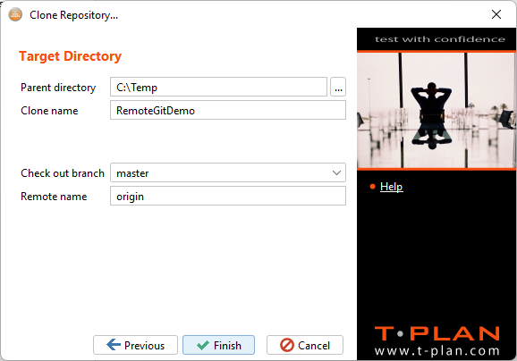 最終画面では、リポジトリをクローンする対象パスとフォルダ名を選択できます。クローン元となるオリジナルリポジトリの名前も指定可能です("リモート名")。デフォルト名はoriginです。ほとんどのドキュメントや例でこの名前が使用されているため、そのまま使用することを推奨します::