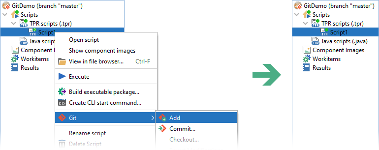 新しいファイル(スクリプト、ワークアイテム、コンポーネントイメージ)を作成すると、プロジェクトツリー上に緑色の疑問符バッジが表示されます。これは、そのファイルがまだGitによって追跡されていないことを示しています。