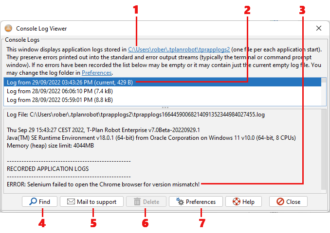 ログビューアは、現在選択されているログファイルの内容を表示します。各ログは、開始日、T-Plan Robotのバージョン、Java/OSの識別情報、およびロボットインスタンスが割り当て可能な最大メモリ(ヒープサイズ)に関する情報を含むログヘッダーで構成されます。ヘッダーの後に続く「記録されたアプリケーションログ」セクションには、キャプチャされたすべてのコンソールログが時系列順に一覧表示されます。
