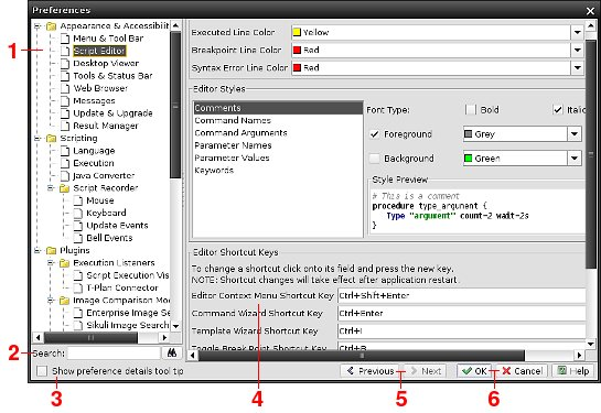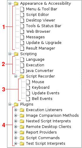 スクリプトレコーダーの設定は、スクリプティングツリーの分岐下で独立したグループを形成します。これらはスクリプトレコーダーの設定に加え、コマンドウィンドウを待機などスクリプトコードを生成する他のGUIコンポーネントの設定も扱います。マウスノードはマウスイベントの記録に関する設定を一覧表示します。マウス移動、クリック、ドラッグの記録設定が可能で、ダブルクリックなどの複合イベントに対するタイムアウト設定も行えます。キーボードノードでは、スクリプトレコーダーがキーボード入力を処理する方法を定義します。複数キーの処理オプションや、テキスト入力後にEnterキーが検出された際のTypeLineコマンド生成条件を設定できます。更新およびベルイベントノードは、デスクトップ更新イベントとベルイベントからWaitForコマンドを生成するコマンドウィンドウを待機で使用されるデフォルト値を提供します。