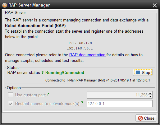 To support communication with the RAP portal the T-Plan Robot Enterprise v4.2 delivered the RAP Server component. It is a TCP/IP server which communicates with the RAP portal. The functionality was significantly improved in the 4.3 release to address the new RAP generation.
