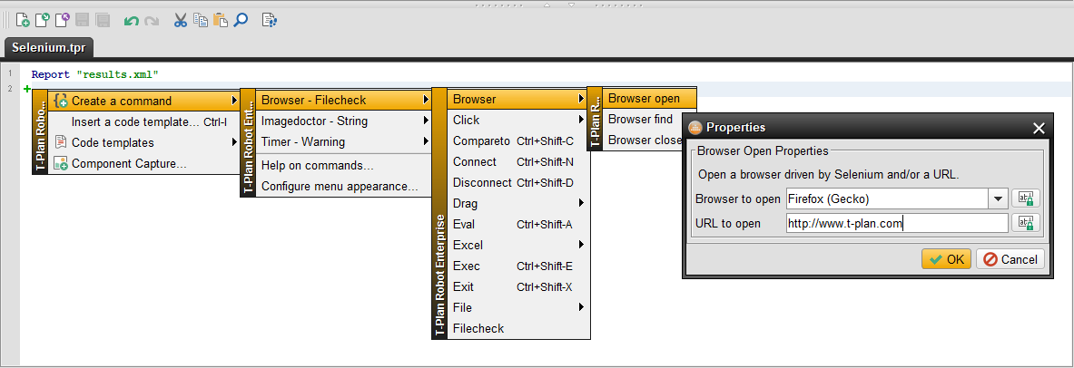 例えば、TPRスクリプトから自動化を実行するには、上記のRobotWikipediaScriptの例から「browserOpen("firefox", "https://www.wikipedia.org")」メソッド呼び出しを削除し、TPRから以下のように呼び出します: