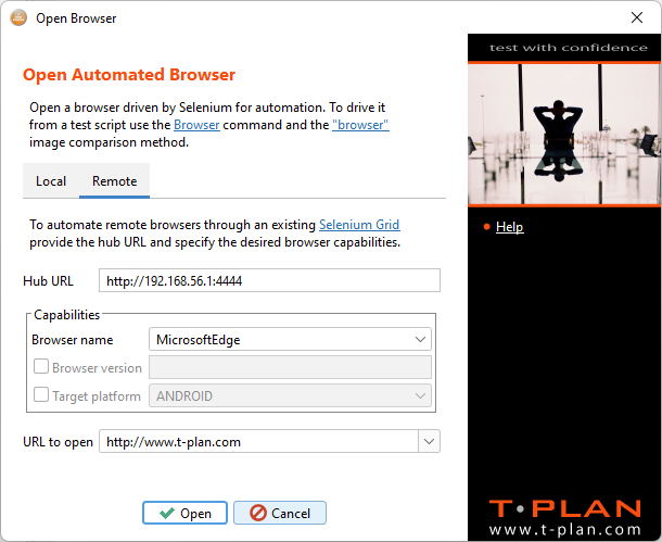 ウィンドウ内のリモートタブを選択し、ハブのURLを入力して対象のブラウザタイプを選択します。開くをクリックして開始します。