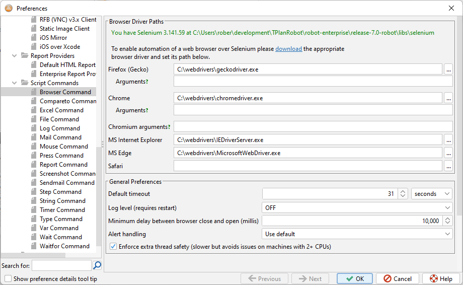 Robot 8 は Selenium 4.25 を使用しますが、Robot 7.x は Selenium Java Client 3.141.59 と統合されています。お使いのバージョンはブラウザコマンド設定で確認できます(下記参照)。ファイルは