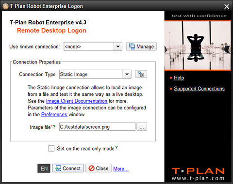 テストスクリプトから接続するには、接続(Connect)コマンド(TPRスクリプト)またはconnect()メソッド(Javaテストスクリプト)を使用します。引数URLは「file://<path>」のような標準ファイルURLである必要があります。また、c/-connectコネクトCLIオプションと組み合わせて、ロボット起動時に接続を確立することも可能です。
