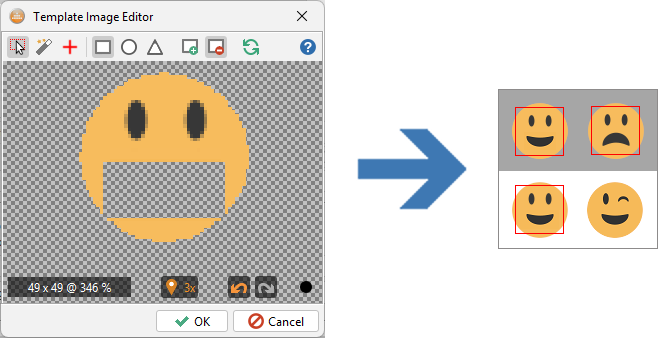 前の例と同様に、画面上のすべてのスマイリーにテンプレートが一致するよう、目を削除します。ただし、このテンプレートを実際のデスクトップと比較する際は注意が必要です。現在単一の色のみで構成されているため、同じ色または類似色の広い領域と一致する可能性があるからです。