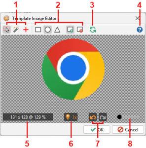 この文書は、リリース8.1で提供される新しい画像エディタについて説明します。特に非矩形画像のサポートを含む、「search2」画像比較アルゴリズムの改良について扱います。このエディタでは、画像から不要なピクセルを透明化することで除去できます。これにより「search2」アルゴリズムは、画面上で一致する領域を探す際に、透明または半透明の領域をすべて無視します。この手法により、背景のないテンプレート画像を作成したり、画像上の対象物の一部を無視したりすることが可能になります。例については透明化ガイドラインの章を参照してください。