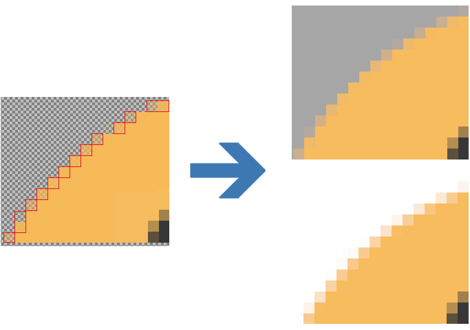 コンポーネント画像、特にアイコンには、オブジェクトの縁に半透明ピクセルが含まれていることがよくあります。これらは背景色と混ざり合い、滑らかなオブジェクトの曲線を生成します。次の画像を注意深くご覧ください。左の画像は元のスマイルアイコンの詳細部分を示しています。半透明ピクセルを赤で強調表示しました。右側の2つの画像は、これらのピクセルが灰色と白の背景とどのように混ざり合うかを示す、画面からの対応する切り抜きです:
