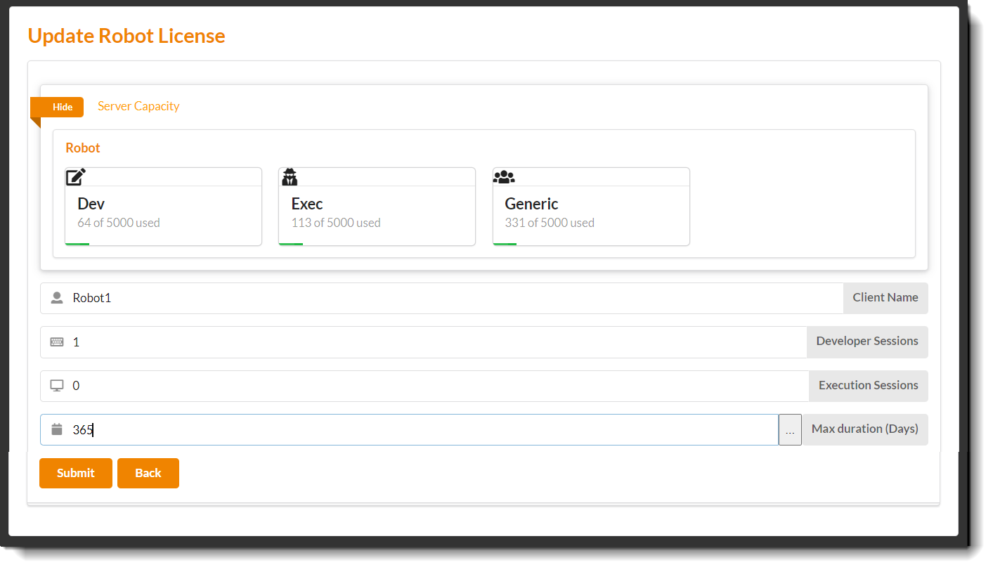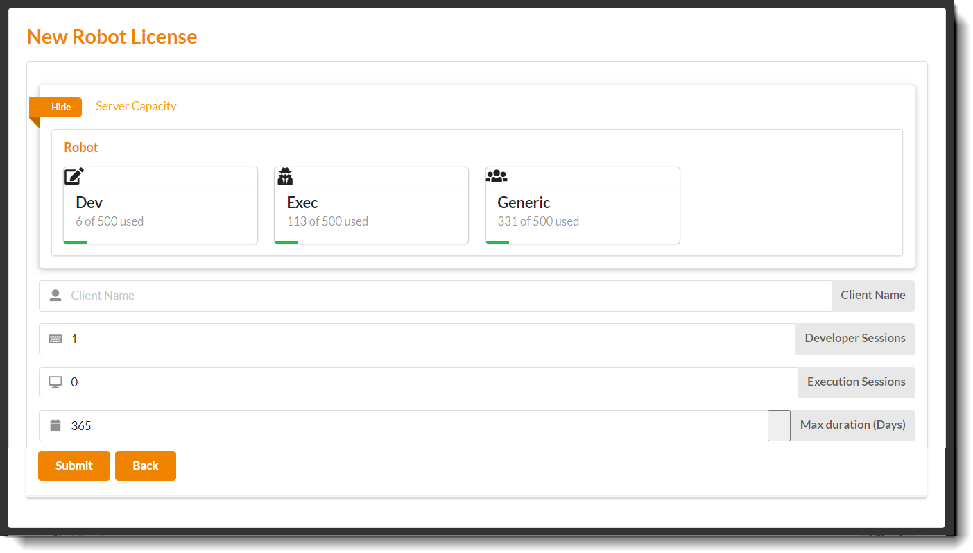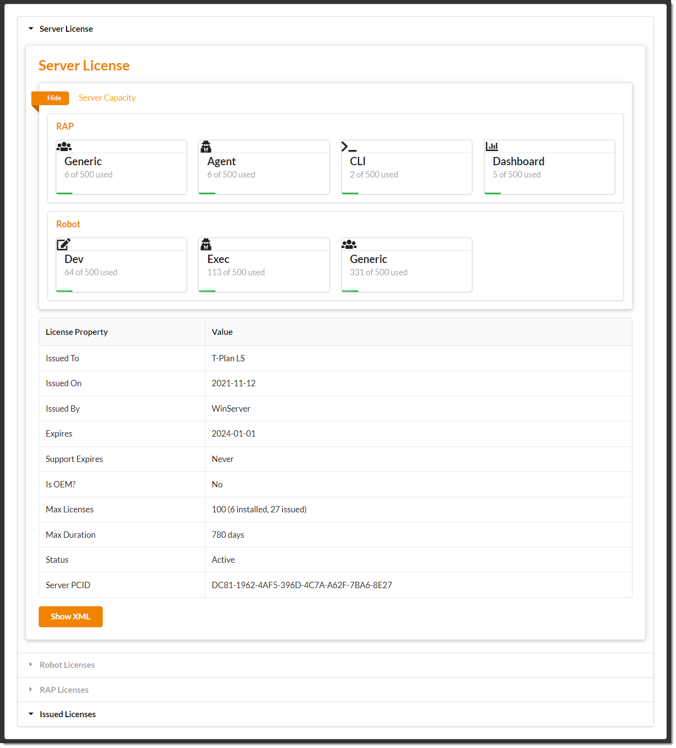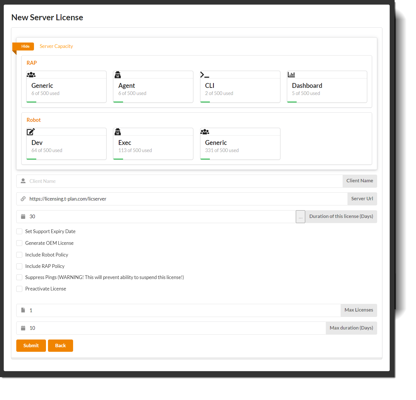Max Licenses - Indicates the maximum number of licenses that can be created within this License Server for both Robot session licenses and child server licenses