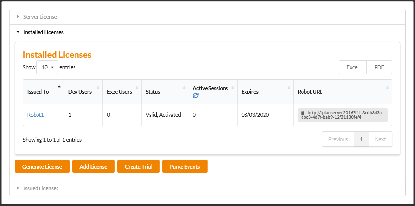 This page lists all Robot 'session' licenses that have been created within this License Server.