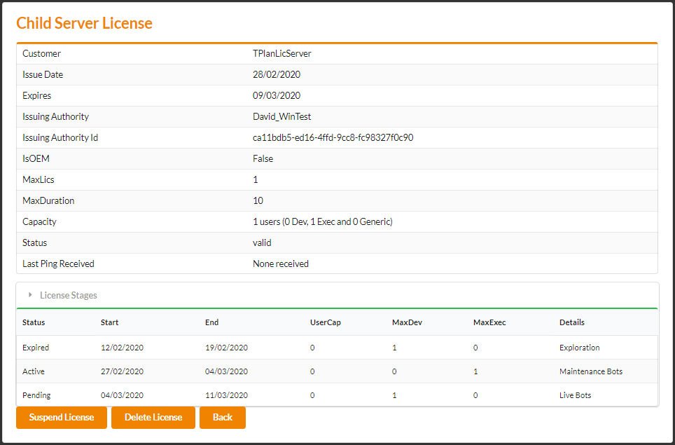 Suspend the license - temporarily force the license to suspend its operations. The child License Server will stop issuing sessions to any Robots until the license is "activated" again.